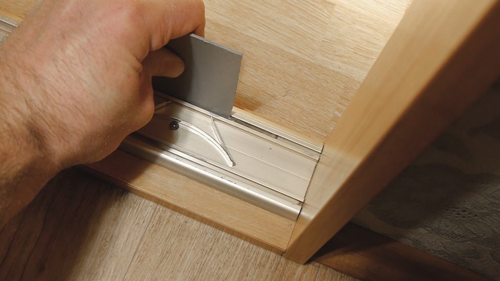 - Efter montering av dörren limmas tätningsborstar på den. De fungerar som skydd mot damm och mjukar upp banan.