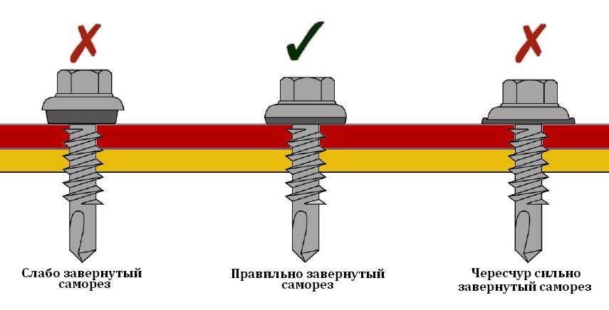 - Det är inte nödvändigt att dra åt fästelementen ordentligt. Det bör vara ungefär en millimeter mellan den och den profilerade plåten. Annars, under den termiska expansionen av materialet under temperaturförändringar, kommer sprickor att uppstå i det. Plus, en hårt skruvad självgängande skruv kommer att klämma gummipackningen. På grund av stresseffekten kommer det snabbt att uppstå sprickor i den, genom vilka vatten kommer att börja tränga in i sprickorna.