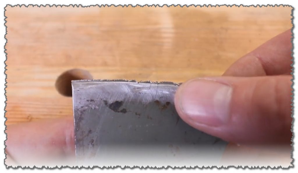 Om man undersöker yxans blad i ljuset kan man se mindre defekter. Yxan är redan väldigt vass, men det finns fortfarande små tandningar på eggen som kommer att slita sönder trädet när det huggas.