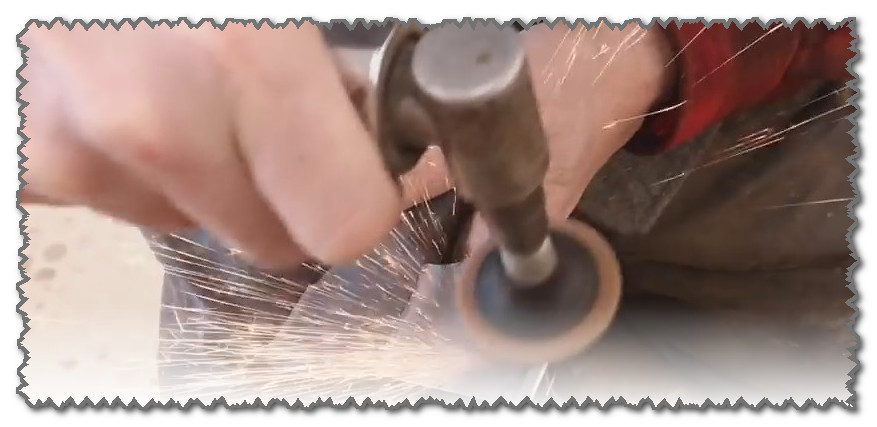 Vi droppar några droppar av en oljehaltig vätska på slipmedlet: lösningsmedel eller fotogen, och i en cirkulär rörelse bearbetar yxans skäregg. Vi håller hörnet.