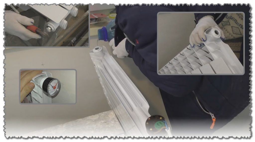 Plugga det nedre grenröret med en tummutter, som är placerad mittemot anslutningspunkten för värmeelementet, installera Mayevsky-kranen (mutter) för att tömma vattnet och installera en tryckmätare. Den senare behöver inte installeras.