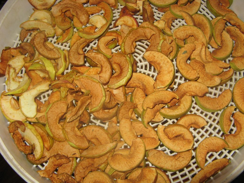 För att torka äpplen på detta sätt räcker det bara att sprida skivorna i ett lager på enhetens pallar, välj torkläge (temperatur och tid) och starta det. Efter den tid som krävs får vi den färdiga produkten.
