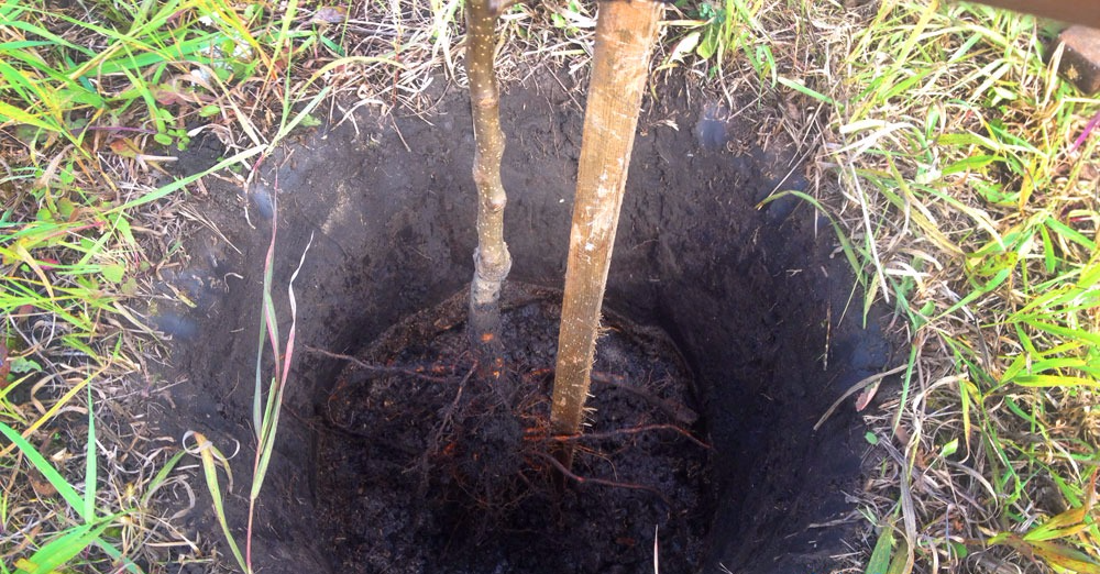 Några dagar efter detta placeras plantan i ett hål och beströs med ett lager av utgrävd jord. Vid dålig jord rekommenderas det under planteringsprocessen att strö plantorna med jord som tagits från mer bördiga områden. I detta fall bör rothalsen vara 2-3 cm över marknivån. Sedan vattnas trädet rikligt (10-20 liter vatten).