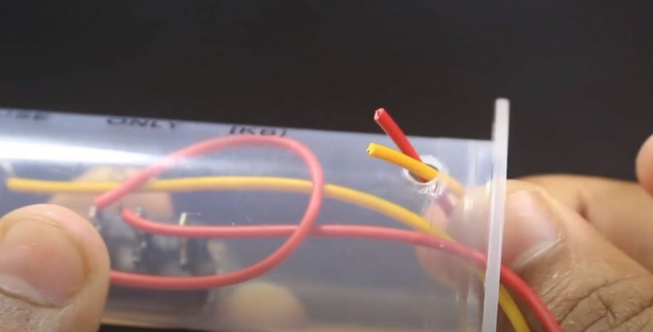Şırınganın silindirinde, kenara daha yakın, bir havya ile bir delik açıp telleri içine getiriyoruz.