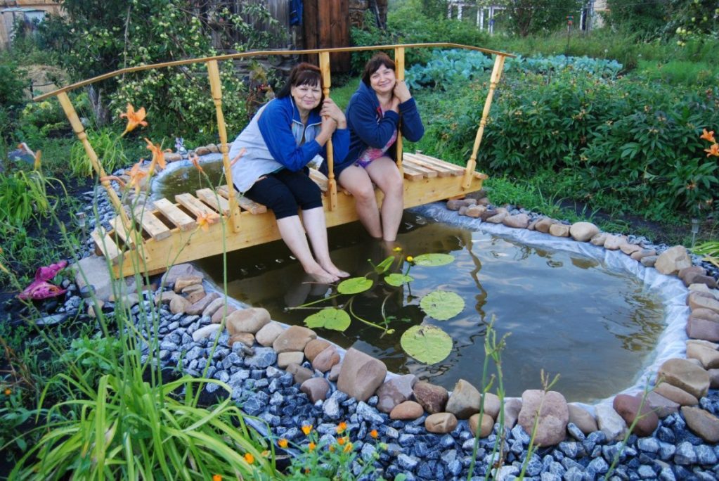 Canlı balıklı bir gölet ve dinlenmek için bir çardak. kendin yap
