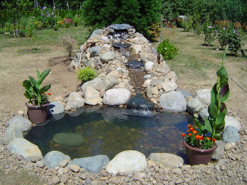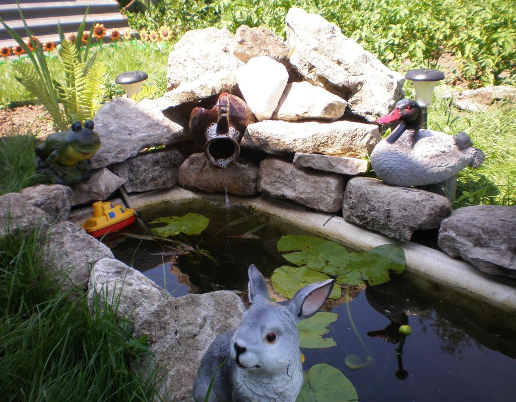 Görünüşe göre pompa, taşlarla gizlenmesi kolay küçük bir kaba benziyor. Beton bir levha veya tuğla üzerine yerleştirilir. Bir su borusu ve bir elektrik teli döşemek için işaretler yapılır. Güçlendirilmiş borunun içine bir kablo yerleştirilir. Her yer taşlarla kaplı. Pompayı elektriğe bağlamak için bir kesici kullanılır. Zamanında filtre değişimini unutmayın.
