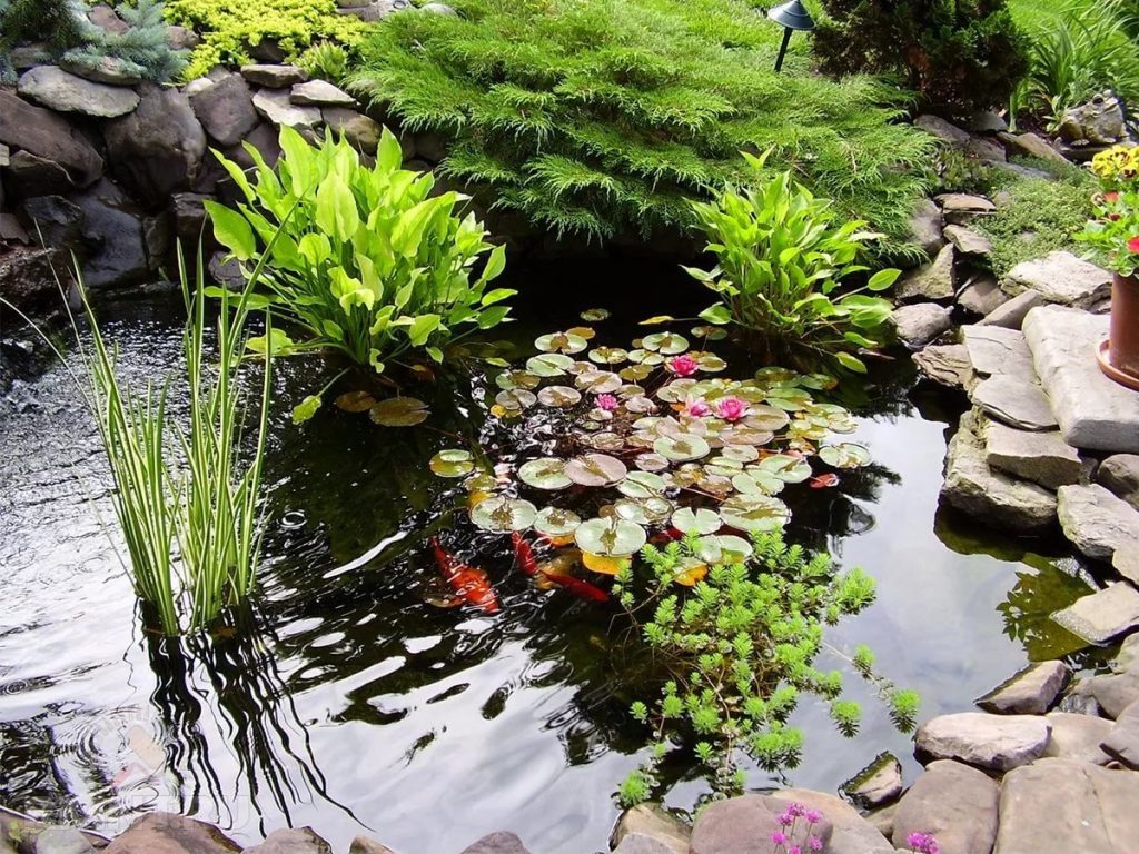 Ev yapımı bir gölet, içinde balık yüzer ve çevresinde bitkiler büyürse çok güzel görünür. Bu gerçekten bir tablo.